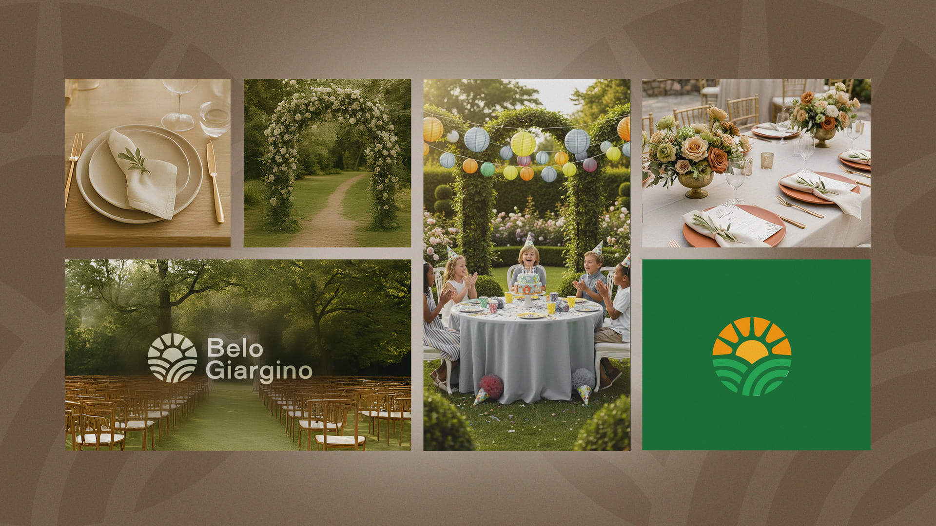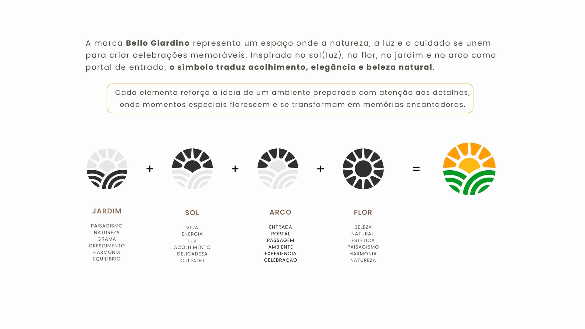 A marca Bello Giardino representa um espaço onde a natureza, a luz e o cuidado se unem para criar celebrações memoráveis. Inspirado no sol, na flor, no jardim e no arco como portal de entrada, o símbolo traduz acolhimento, elegância e beleza natural. Cada elemento reforça a ideia de um ambiente preparado com atenção aos detalhes, onde momentos especiais florescem e se transformam em memórias encantadoras.