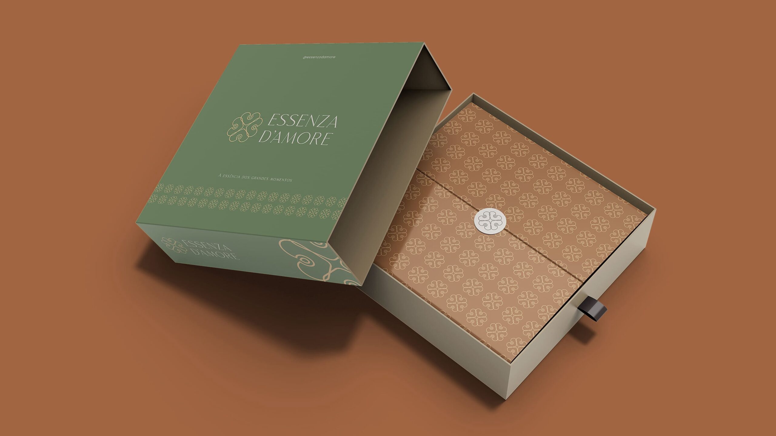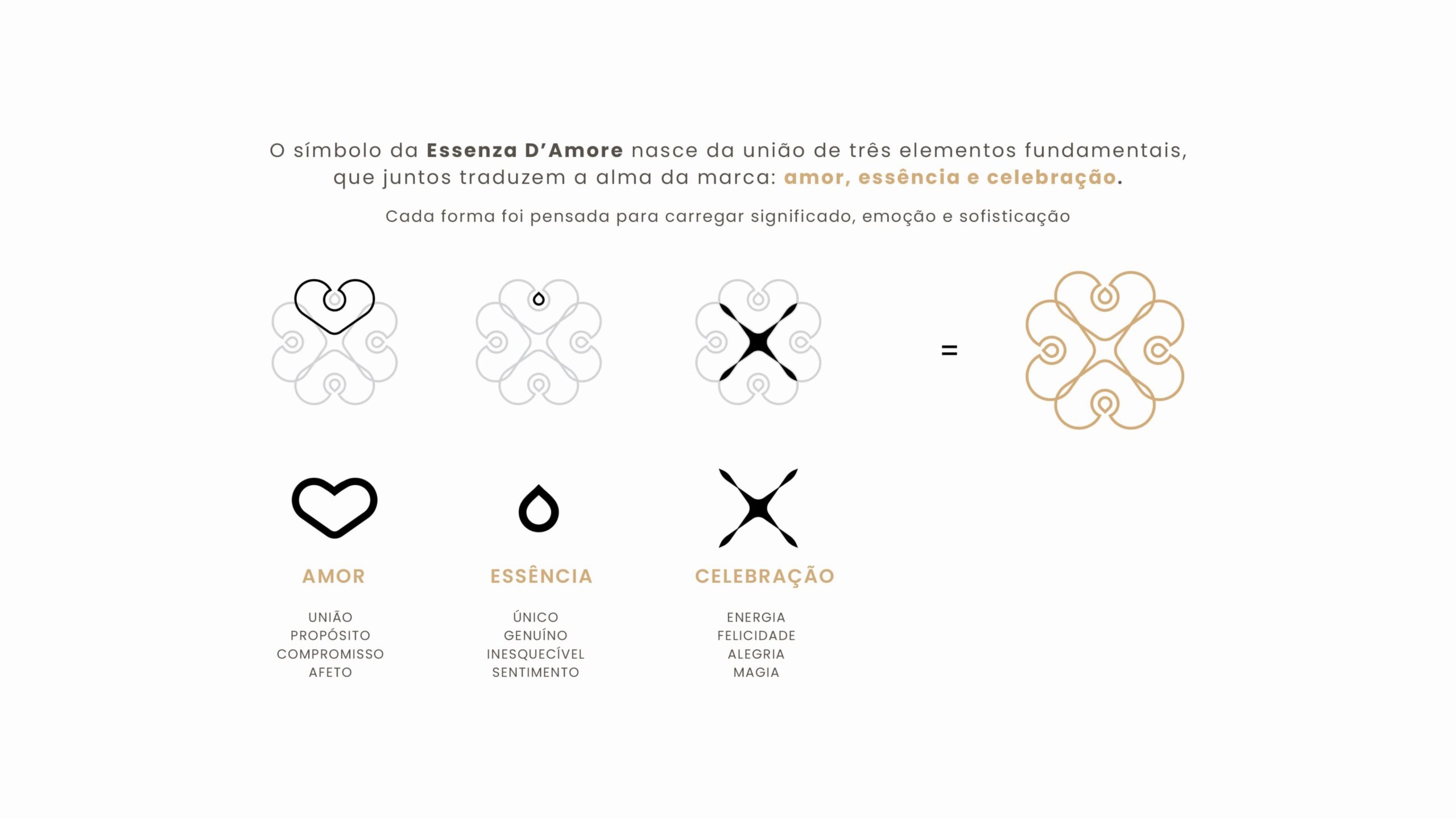 O símbolo da Essenza D’Amore nasce da união de três elementos fundamentais, que juntos traduzem a alma da marca: amor, essência e celebração. Cada forma foi pensada para carregar significado, emoção e sofisticação